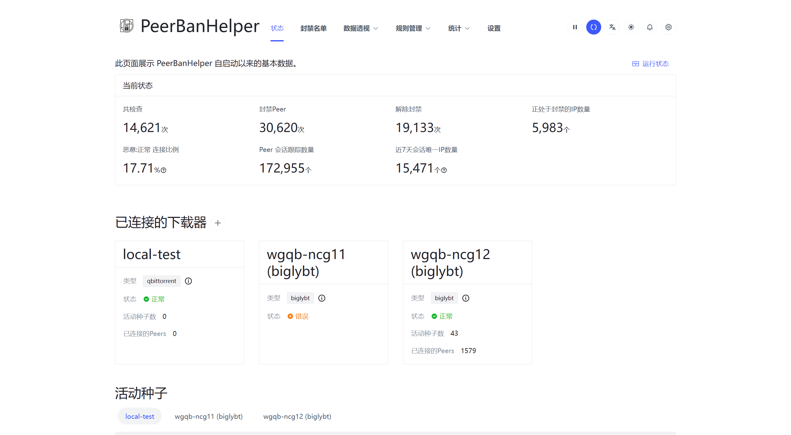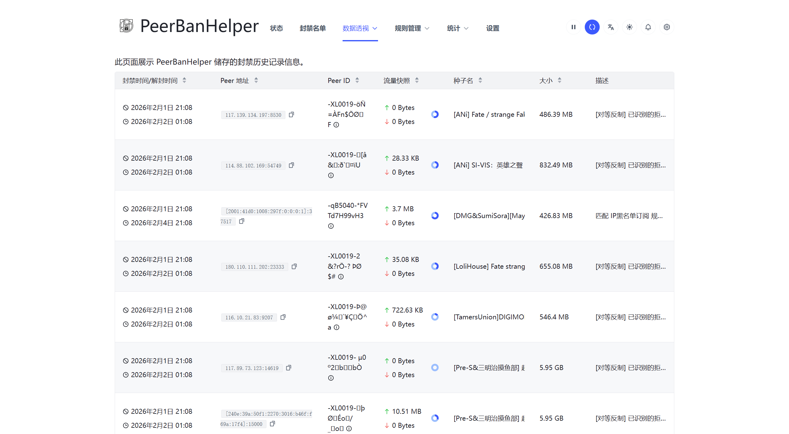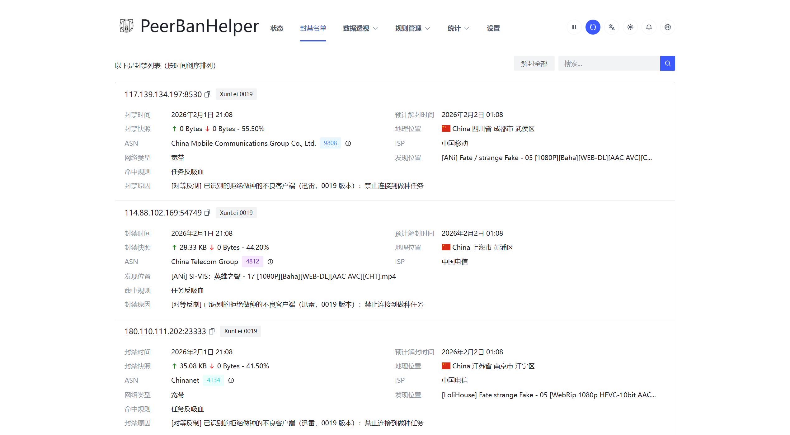 自动封禁不受欢迎、吸血和异常的 BT 客户端,并支持自定义规则。PeerId黑名单/UserAgent黑名单/IP CIDR/假进度/超量下载/进度回退/多播追猎/连锁封禁/伪装检测 支持 qBittorrent/Transmission/Deluge/BiglyBT/Vuze(Azureus)/BitComet